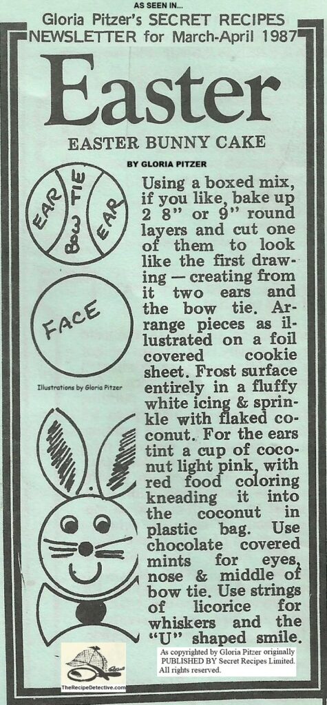 By Gloria Pitzer, as seen in her self-published newsletter… Gloria Pitzer’s Secret Recipes Newsletter (Secret RecipesTM, St. Clair, MI; Mar.-Apr. 1987, p. 12).