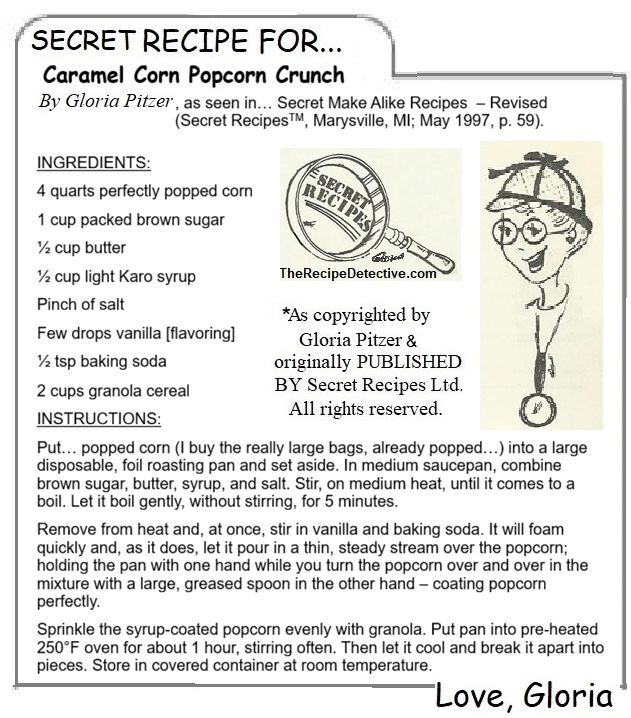 In honor of last Monday, which I missed, being National Caramel Popcorn Day, here’s Mom’s secret recipe for “Caramel Corn Popcorn Crunch”; as seen in her self-published cookbook, Secret Make Alike Recipes – Revised (Secret RecipesTM, Marysville, MI; May 1997, p. 59). As always, I’m asking only for proper credit if you care to re-share it.
