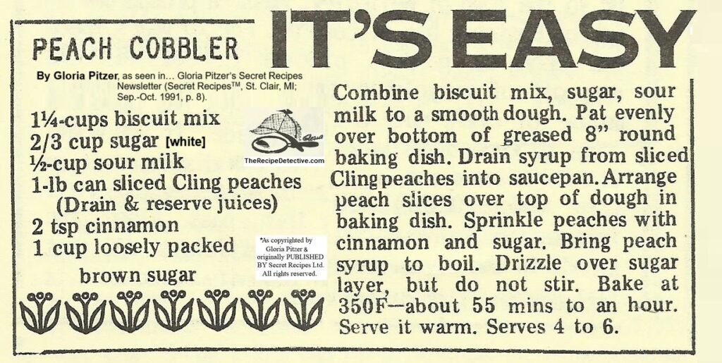 PLUS, in honor of TODAY, being National Peach Cobbler Day, here’s Mom’s secret recipe for “Peach Cobbler”, as seen in… Gloria Pitzer’s Secret Recipes Newsletter (Secret RecipesTM, St. Clair, MI; Sep.-Oct. 1991, p. 8). As always, I’m asking only for proper credit if you care to re-share it.
